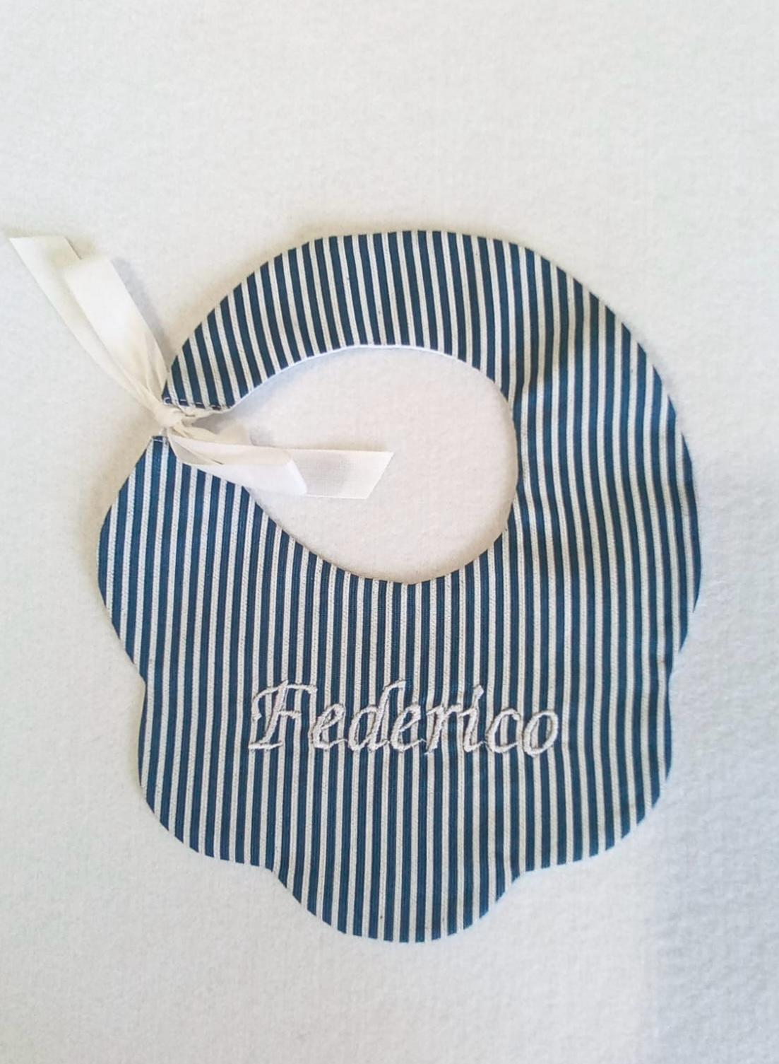 Deliziosa bavetta per asilo con righe blu e bianche, realizzata a mano con tessuti morbidi e resistenti. Su richiesta il bavaglino può essere personalizzato con il nome del bambino, rifinita con cura nei dettagli.