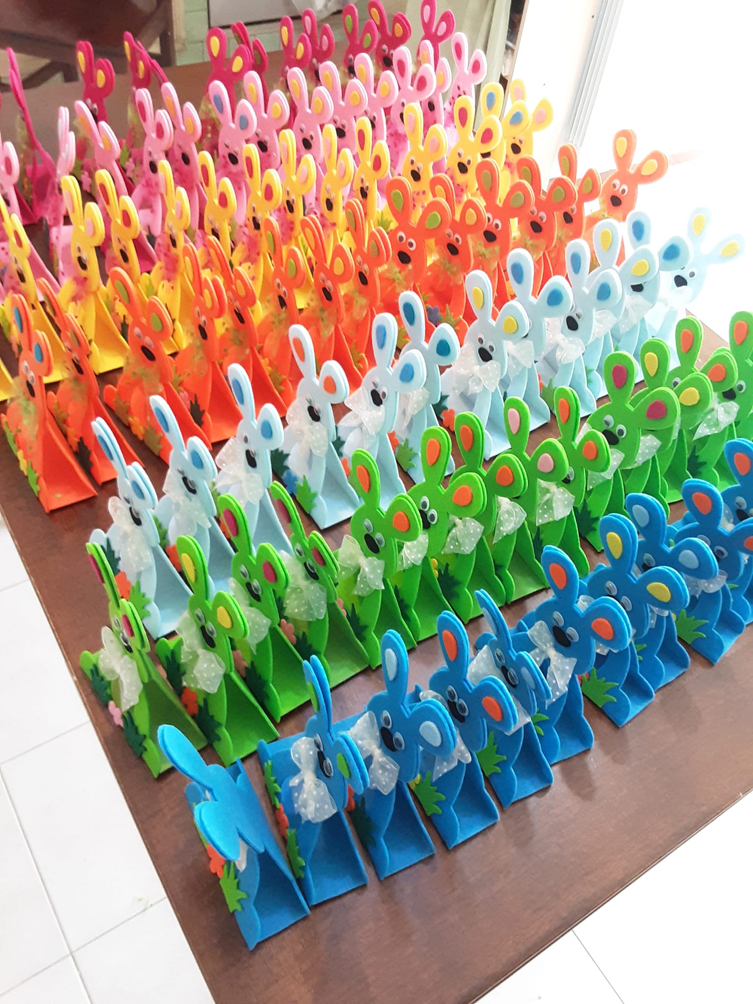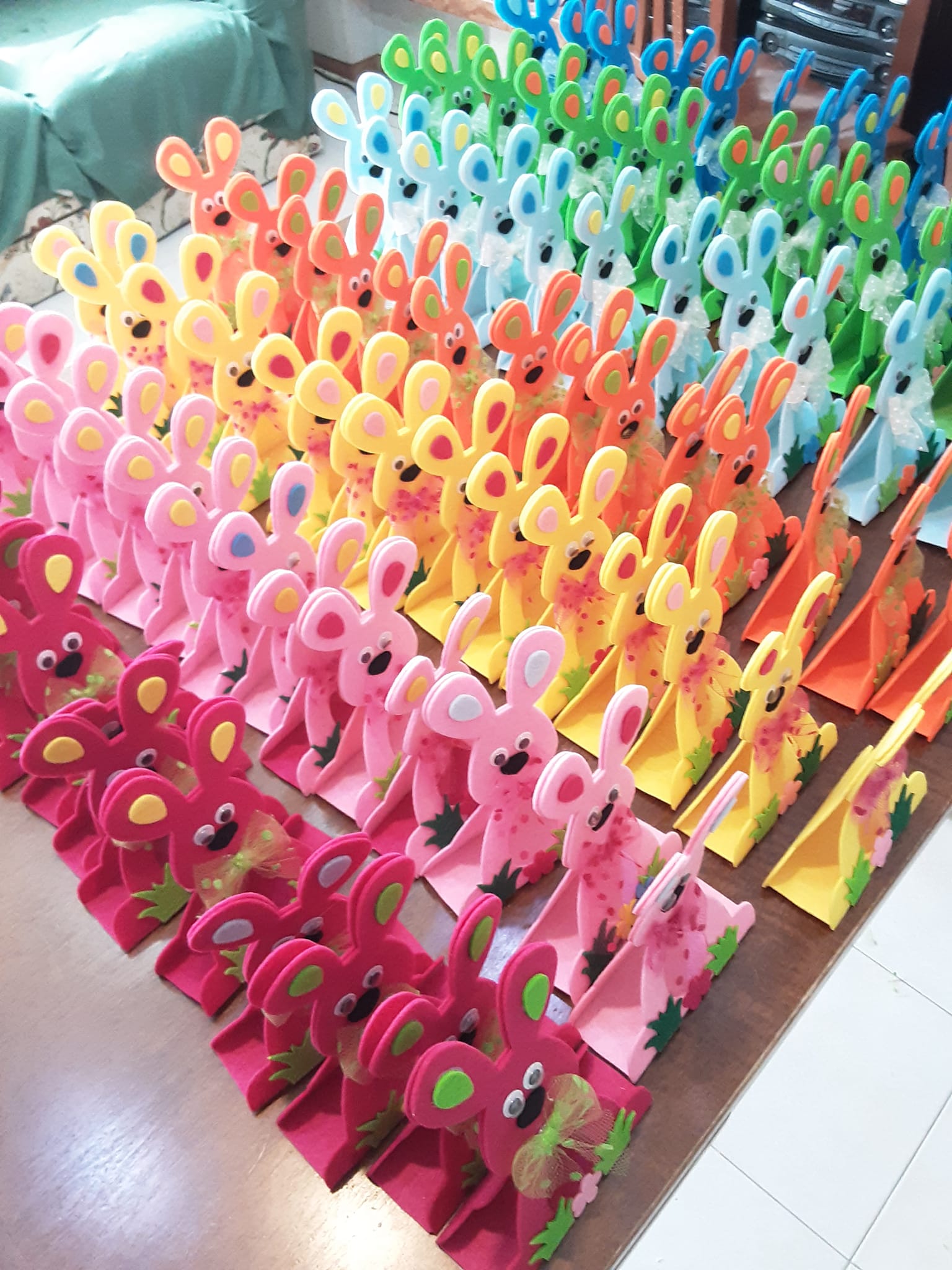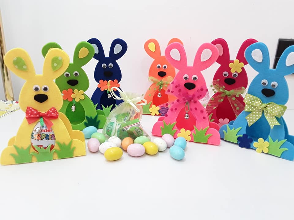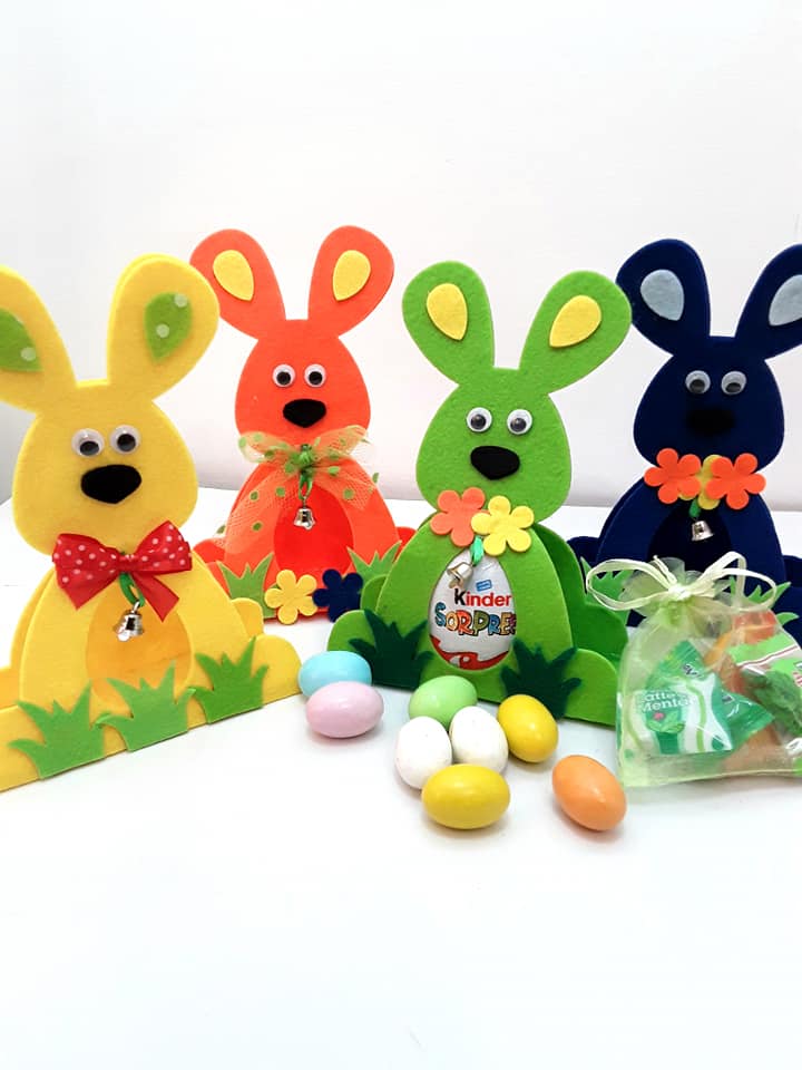 Coloratissime bomboniere di Pasqua a forma di coniglietto, realizzate in feltro e decorate a mano con fiocchetti, fiori e dettagli primaverili. Perfette come idee regalo per maestre, educatrici, bambini o per abbellire la tavola pasquale con un tocco di allegria. Ogni coniglietto può contenere un ovetto di cioccolato o piccoli confetti (inclusi su richiesta).