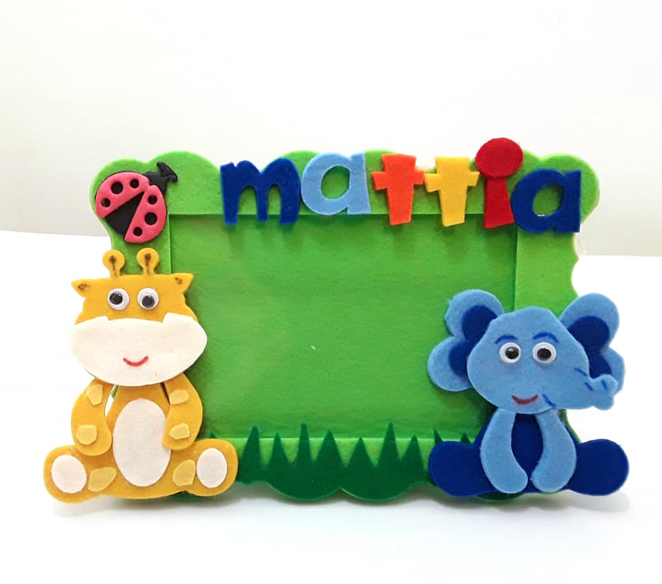 Un’idea regalo dolcissima e colorata: questo portafoto personalizzato in feltro è realizzato interamente a mano con dettagli allegri e teneri animaletti come giraffa, elefantino e coccinella.