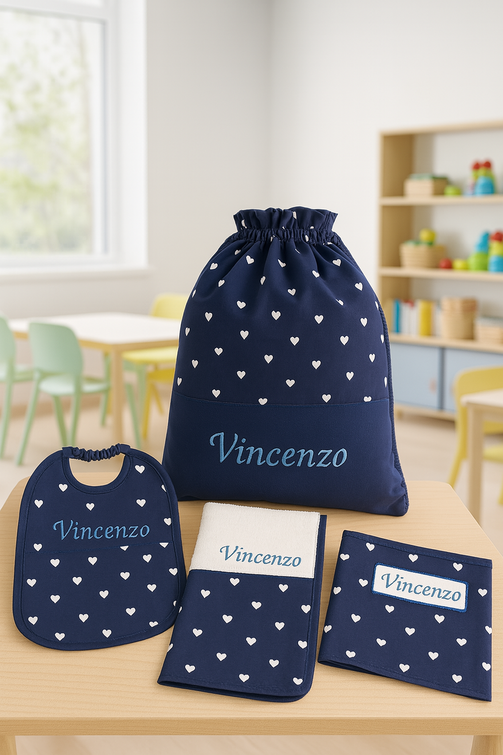 Set Asilo Personalizzato Blu con Cuori Bianchi – 4 Pezzi