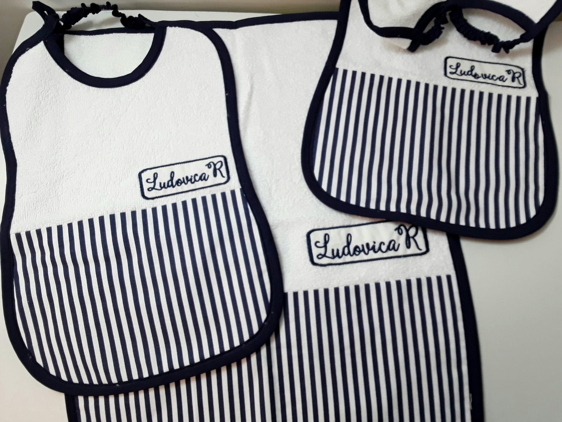 Set Asilo Righe Blu Personalizzato – 2 Bavette e 1 Asciugamano