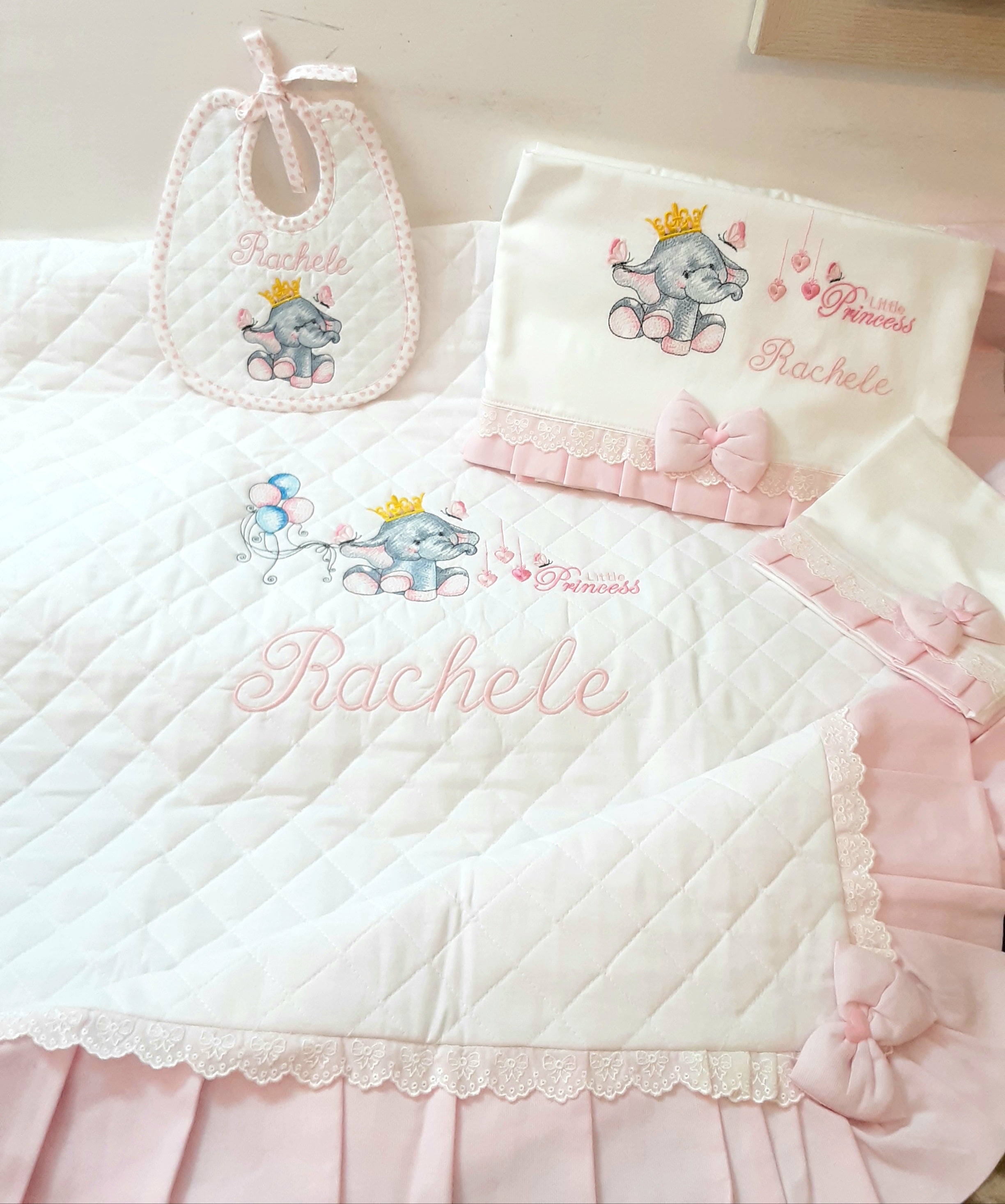Nel nostro atelier trovi anche SET NASCITA personalizzati, set ASILO completi con SACCHE, BAVETTE e FASCIATOIO fatti a mano e con materiali di qualità